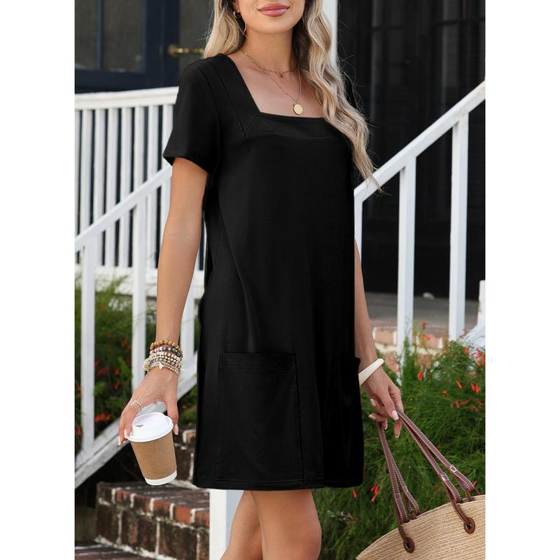 Crafted from a soft and slightly stretchy fabric, this bodycon dress offers a flattering fit that accentuates your curves while allowing for comfortable movement. The unique square neckline adds a touch of modern elegance, framing your décolletage beautifully. Practicality meets style with two functional front pockets, perfect for carrying small essentials like your phone or keys.